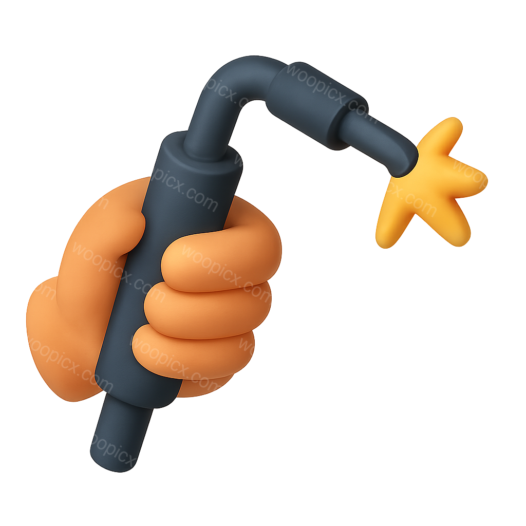 A stylized 3D icon featuring a hand gripping a welding torch, designed with a transparent background and a three-quarter view that gives a volumetric and isometric feel. The torch emits a glowing effect.