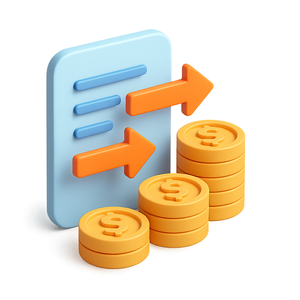 A visually striking 3D icon featuring stacked coins alongside a document with arrows indicating data transfer. The design has a transparent background and a volumetric feel.