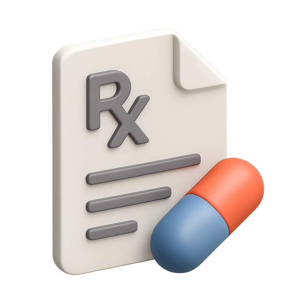 A visually appealing 3D icon featuring a prescription document alongside a colorful capsule pill, designed with a transparent background and isometric view.