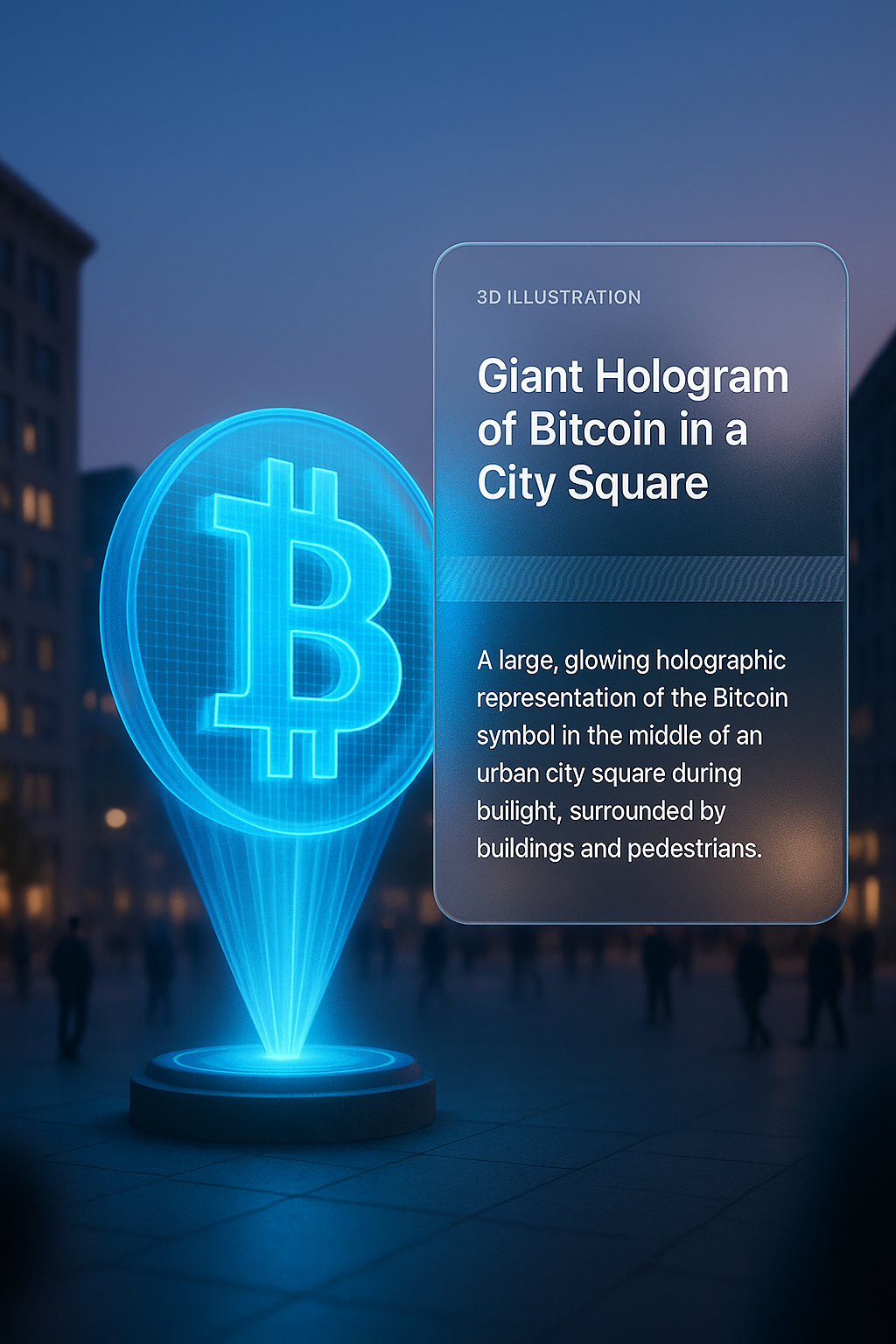 Giant Bitcoin Hologram in Urban Square at Dusk