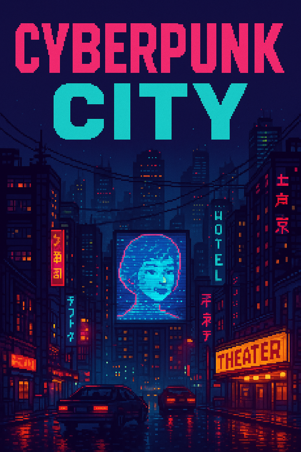 Vibrant Pixel Art Cityscape in Cyberpunk Style
