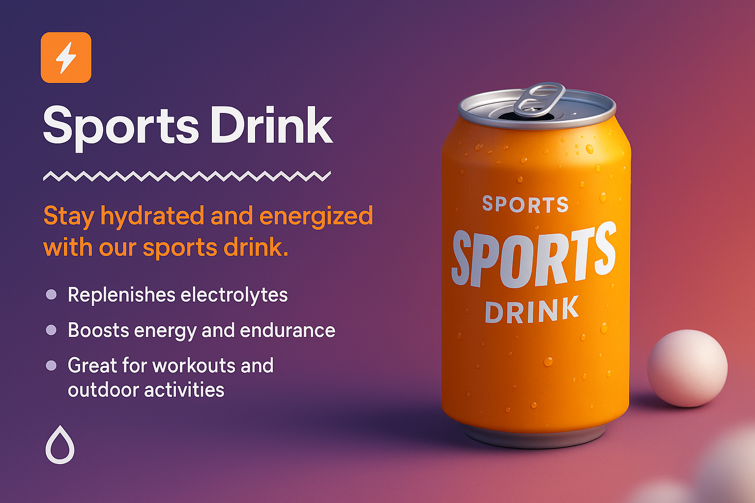 A visually appealing 3D illustration of a sports drink can, featuring vibrant colors and design elements. The can is labeled with key benefits.