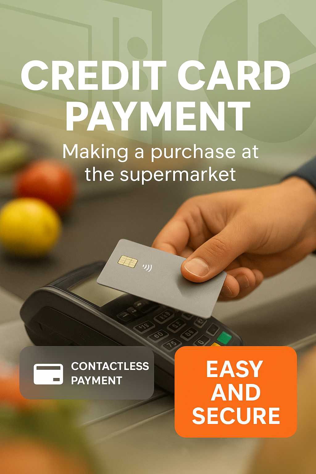 Informative graphic depicting a credit card payment process at a supermarket checkout, ideal for promoting secure and contactless payment options.