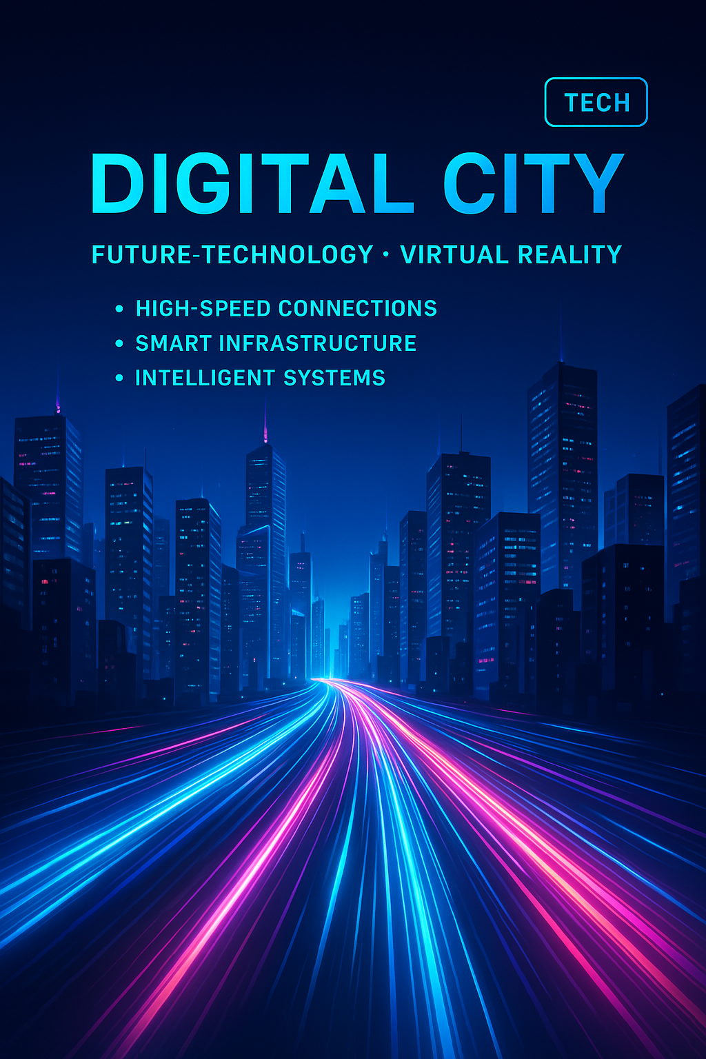 A vibrant digital city illustration featuring glowing lights and futuristic skyscrapers, ideal for tech-related content and virtual reality themes.