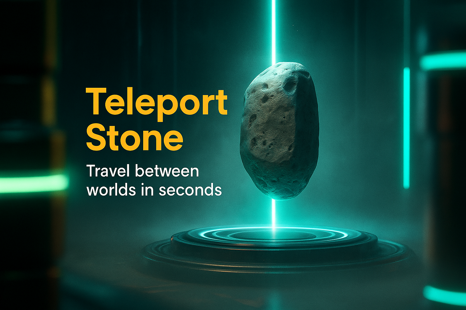 /Collection: /by davooda/Type: PNG/A visually striking image of a teleport stone illuminated by neon accents, set against a misty background. The design features layered composition with bold text emphasizing the concept of travel between worlds.