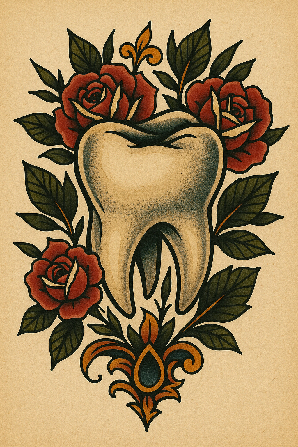 This graphic features a stylized tooth surrounded by roses and leaves, showcasing a vintage tattoo art style. Ideal for dental clinics or art prints.
