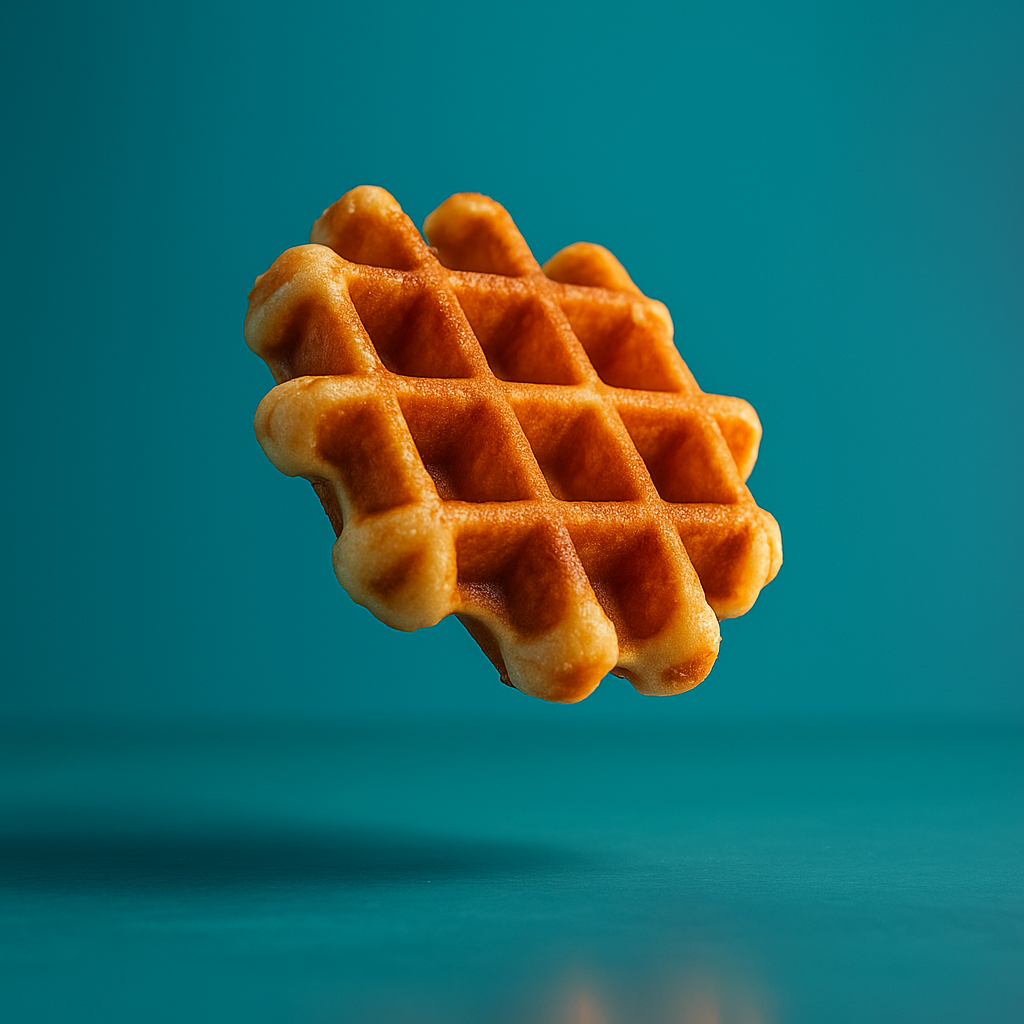 A realistic depiction of a waffle suspended in mid-air against a smooth, vibrant background. The scene captures the waffle with lighting that enhances its texture and form.