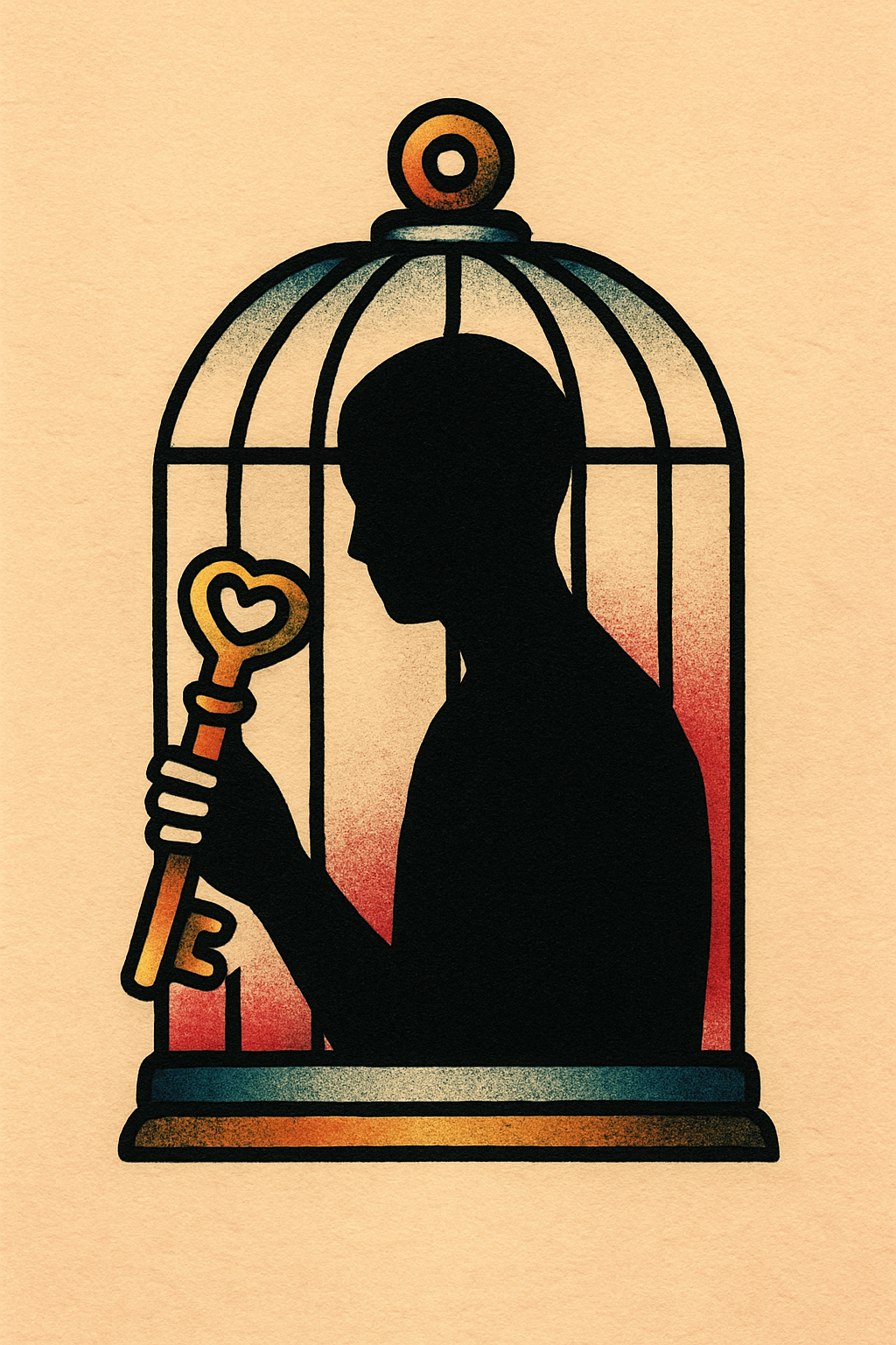 A striking tattoo design featuring a silhouette of a person holding a key inside a cage. The art is colorful against a light beige background, showcasing intricate details.