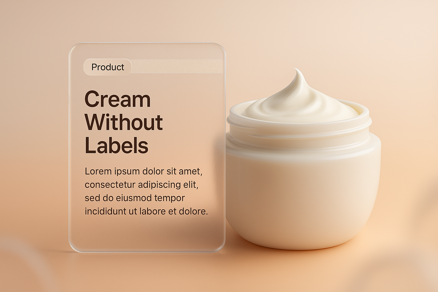 A 3D illustration featuring a cream jar beside a transparent glass label. The smooth, gradient background enhances the visual appeal, with a focus on realism and minimalistic design.