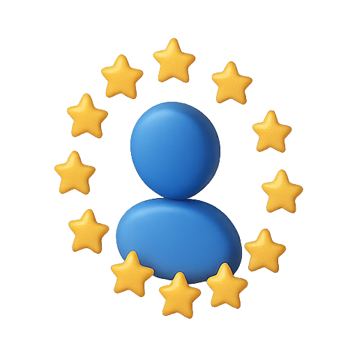 A stylized user icon depicted in blue, encircled by golden stars, representing achievement or recognition. Ideal for user profile or achievement-related graphics.