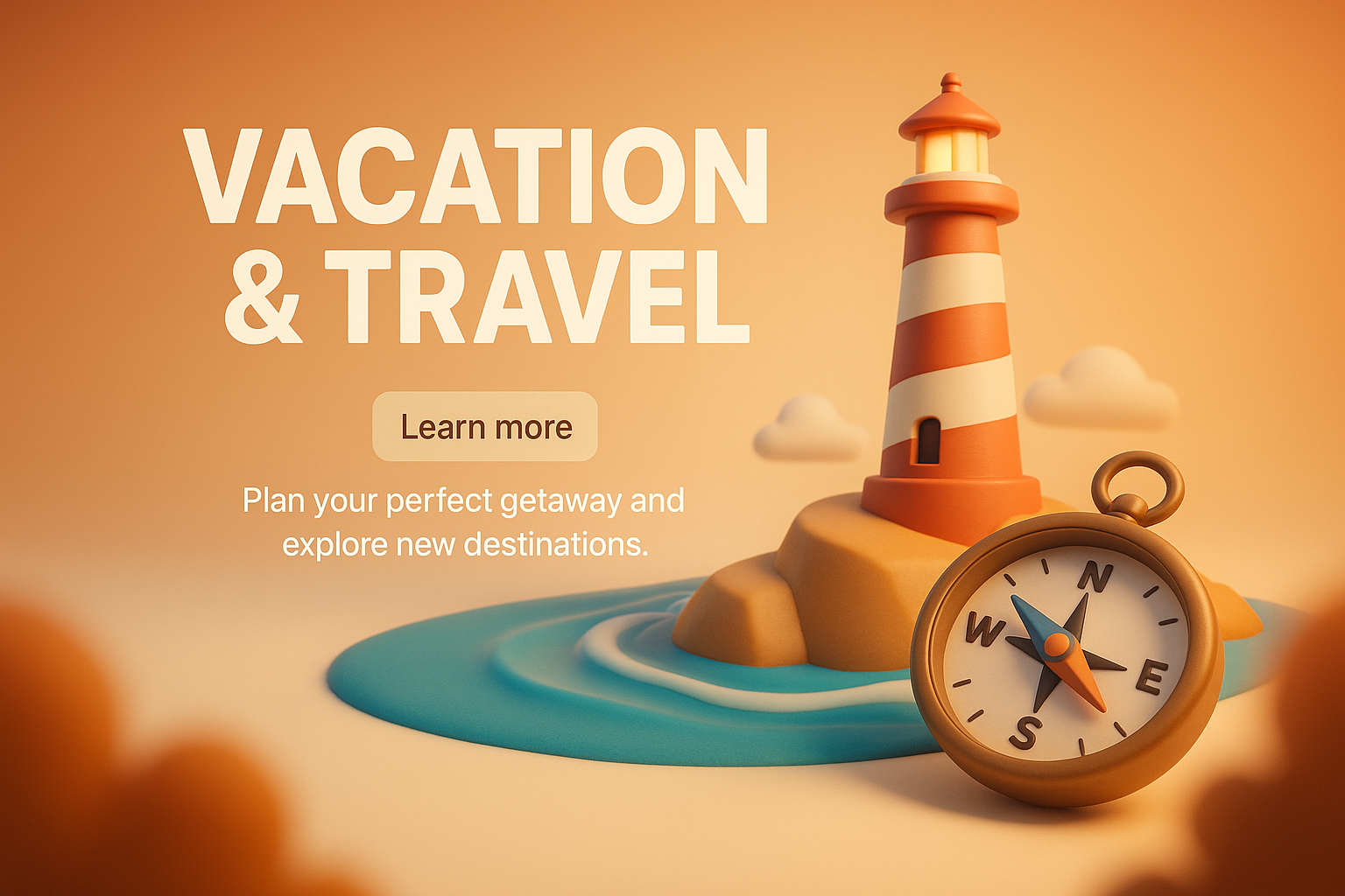 A vibrant 3D illustration featuring a lighthouse and compass, designed for vacation and travel promotions. Ideal for travel agencies and tourism marketing.