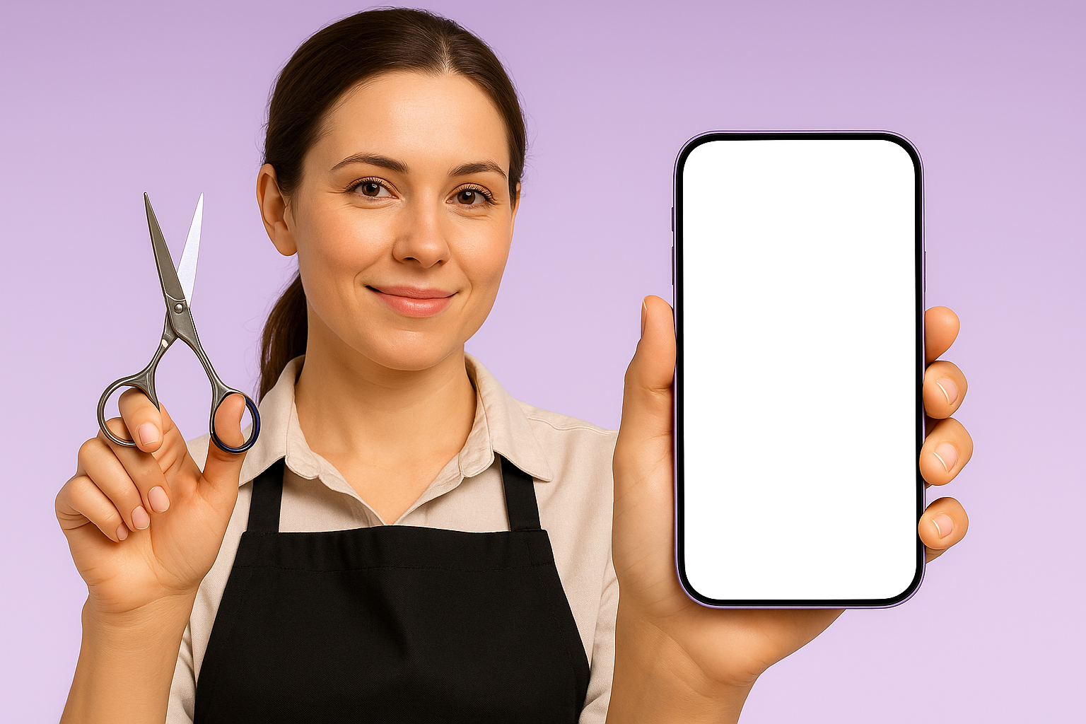 A woman hairstylist smiles while holding a pair of scissors in one hand and a sleek smartphone in the other. The phone features a blank screen against a soft purple background.