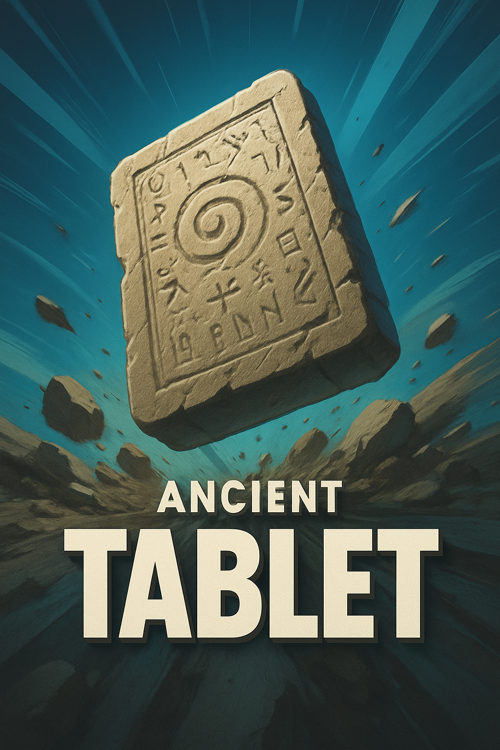 /Collection: /by davooda/Type: PNG/A dramatic 3D illustration of an ancient tablet, featuring bold typography and a dynamic background. The tablet appears to be emerging from a rocky environment, enhancing its mystique.