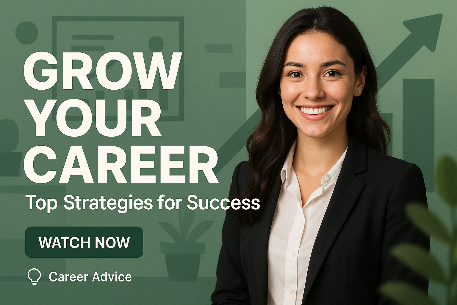 Engaging promotional graphic designed for career development, featuring a confident professional in a modern office setting, ideal for social media or website use.