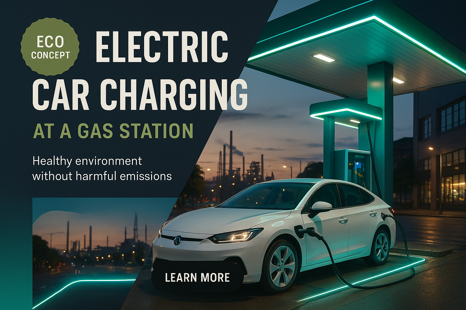 /Collection: /by davooda/Type: PNG/An electric car is charging at a modern gas station illuminated with neon elements. The urban industrial landscape features a healthy environment, emphasizing eco-friendliness and zero emissions.