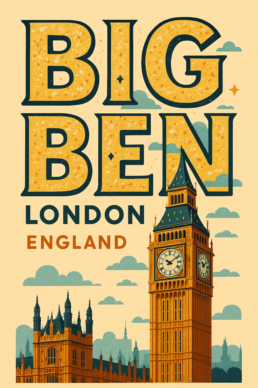 A vibrant and stylized illustration of Big Ben, featuring bold typography and a retro color palette, ideal for travel promotion or decorative art.