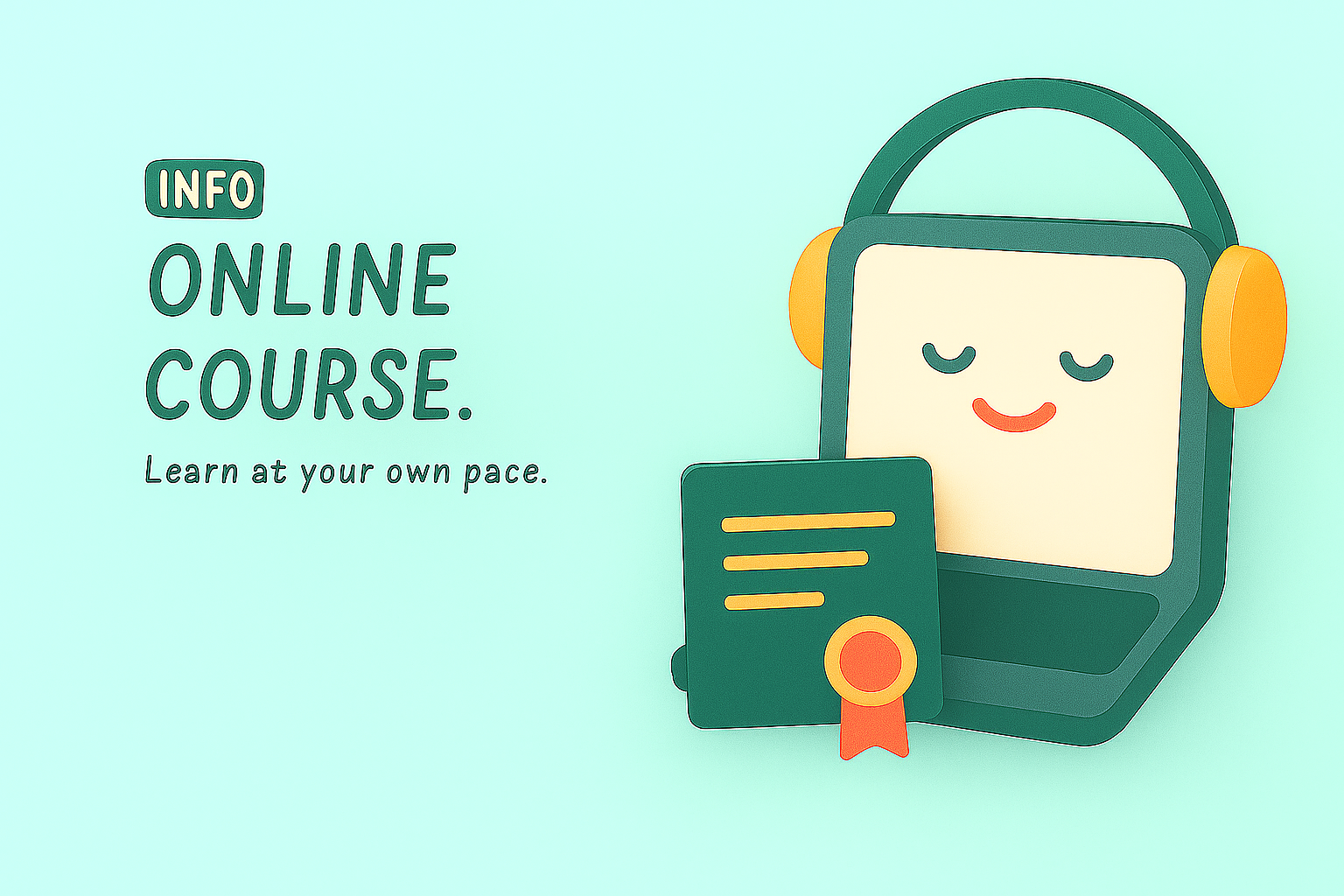 A whimsical graphic depicting a laptop with headphones and a certificate, promoting an online course. The light pastel background enhances the friendly tone, making it suitable for educational platforms.
