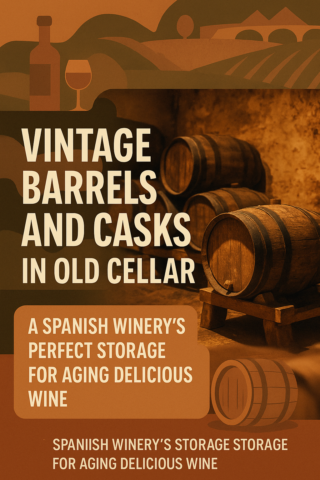 /Collection: /by davooda/Type: PNG/Informative graphic showcasing vintage barrels and casks in an old cellar, designed for promoting a Spanish winery's wine aging process. Ideal for wine enthusiasts and marketing.