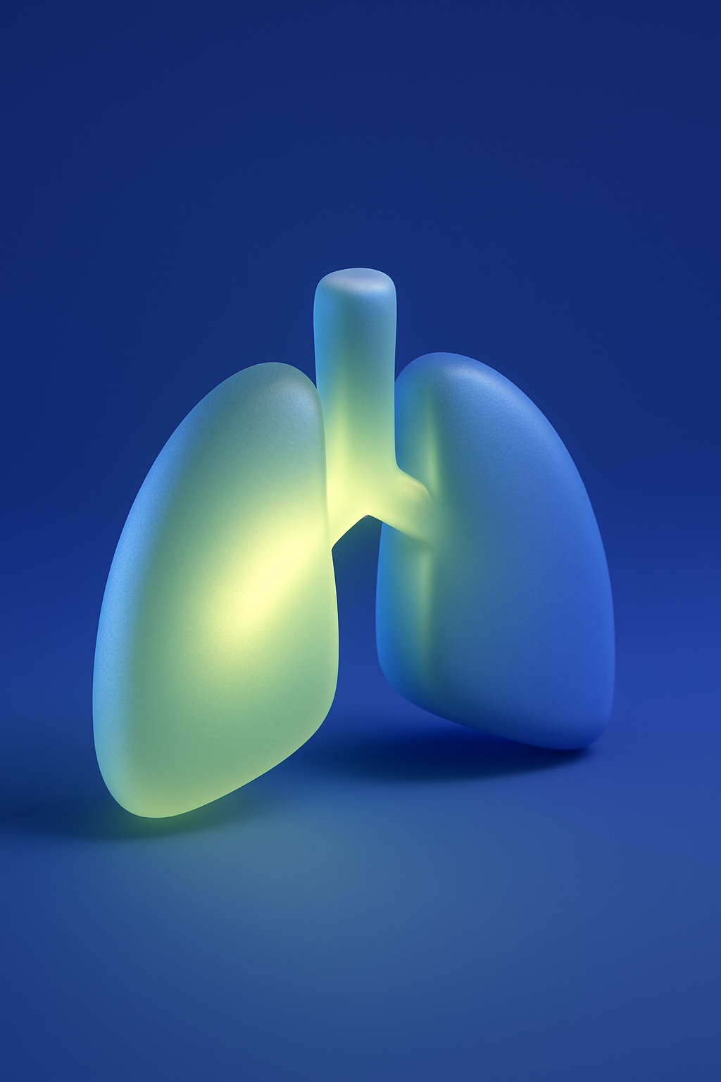 A realistic 3D representation of lungs, featuring a glowing effect and semi-transparent materials. The composition is illuminated softly against a solid blue background.