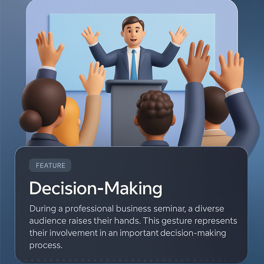 /Collection: /by davooda/Type: PNG/A 3D illustration depicting a professional seminar where a diverse audience actively raises their hands. The scene highlights engagement in a decision-making process.