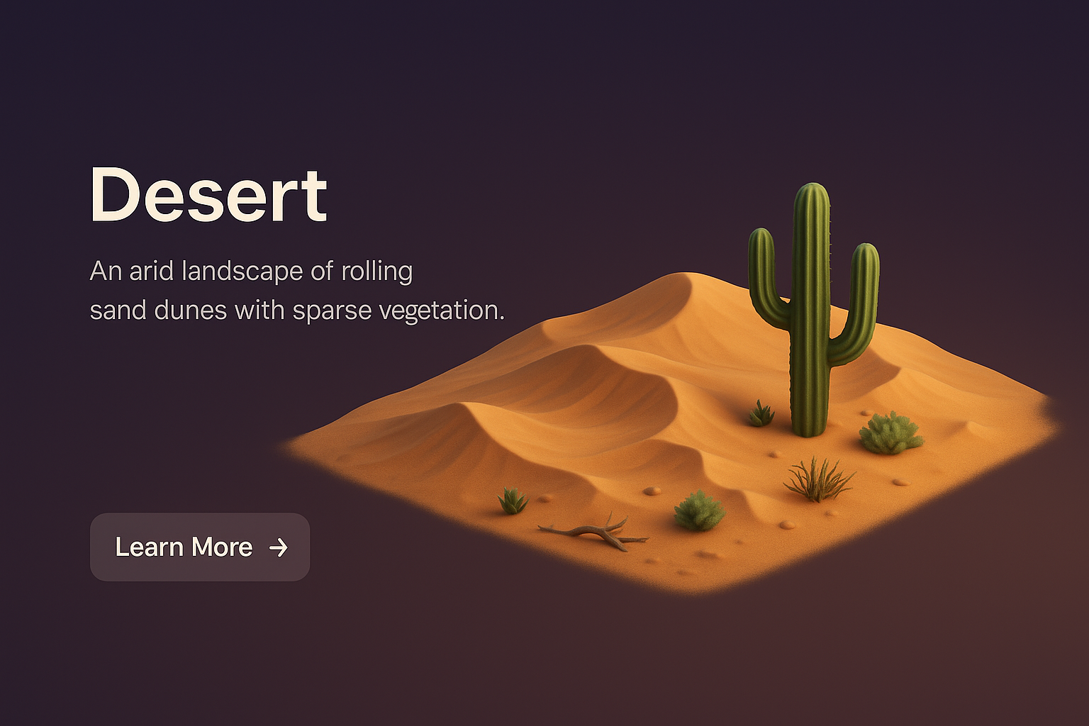 A realistic 3D depiction of a desert with rolling sand dunes and sparse vegetation. A tall cactus stands prominently amidst the sandy terrain, creating a vivid contrast against the dark gradient background.