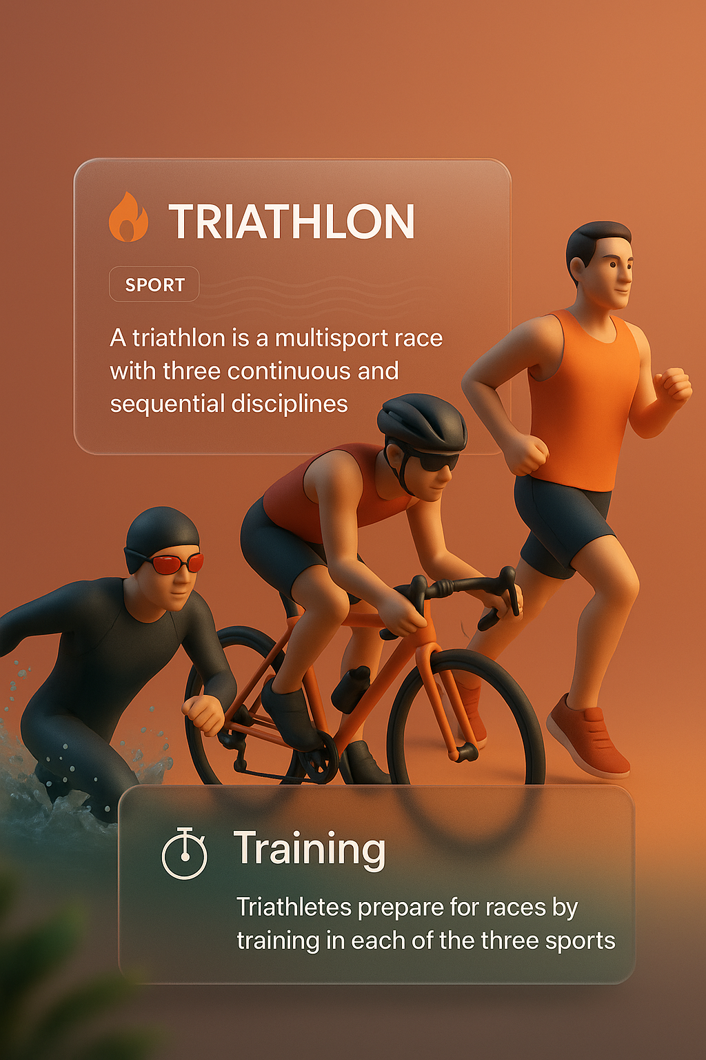 A vibrant 3D illustration depicting triathletes engaged in cycling and swimming, with a stylish overlay that integrates textual blocks for sport description and training insights.
