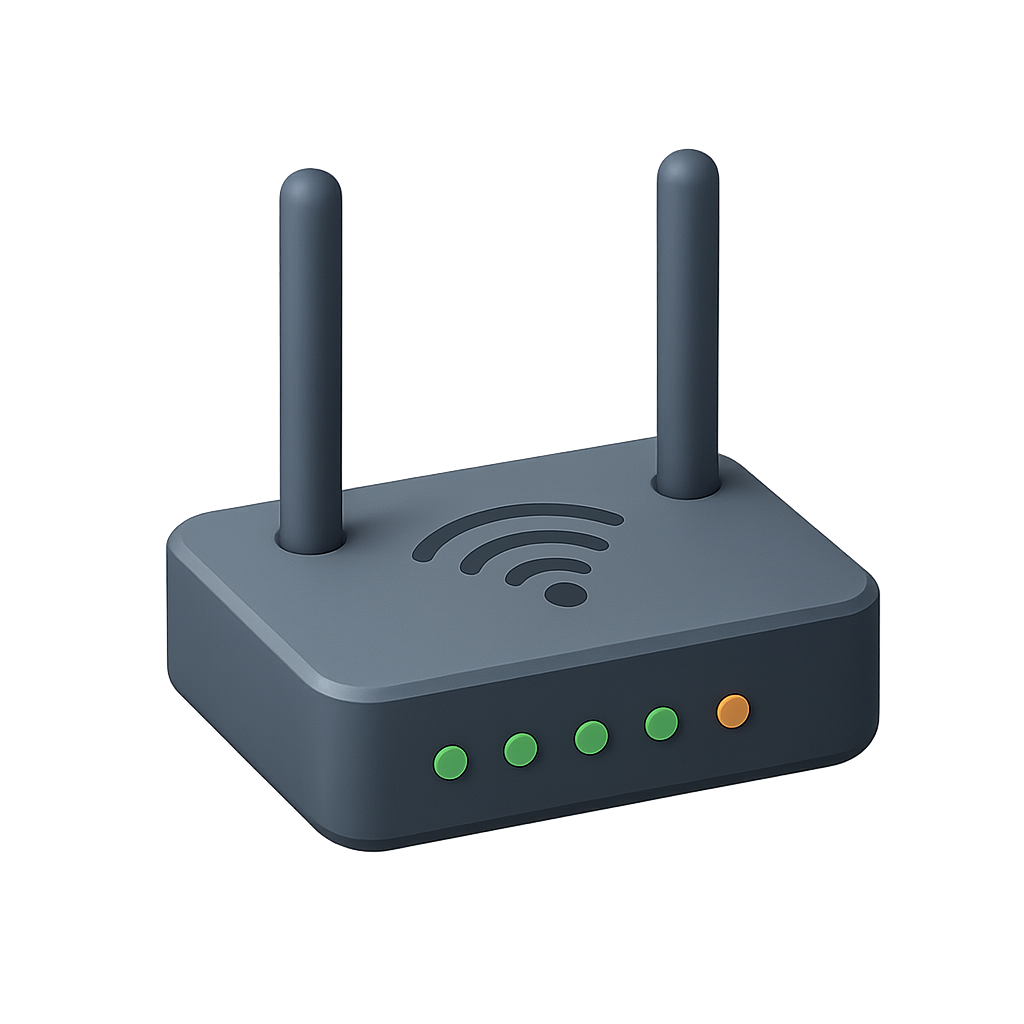 A sleek, isometric 3D representation of a router featuring two antennas and LED indicators. The design emphasizes depth and a modern aesthetic with a transparent background.