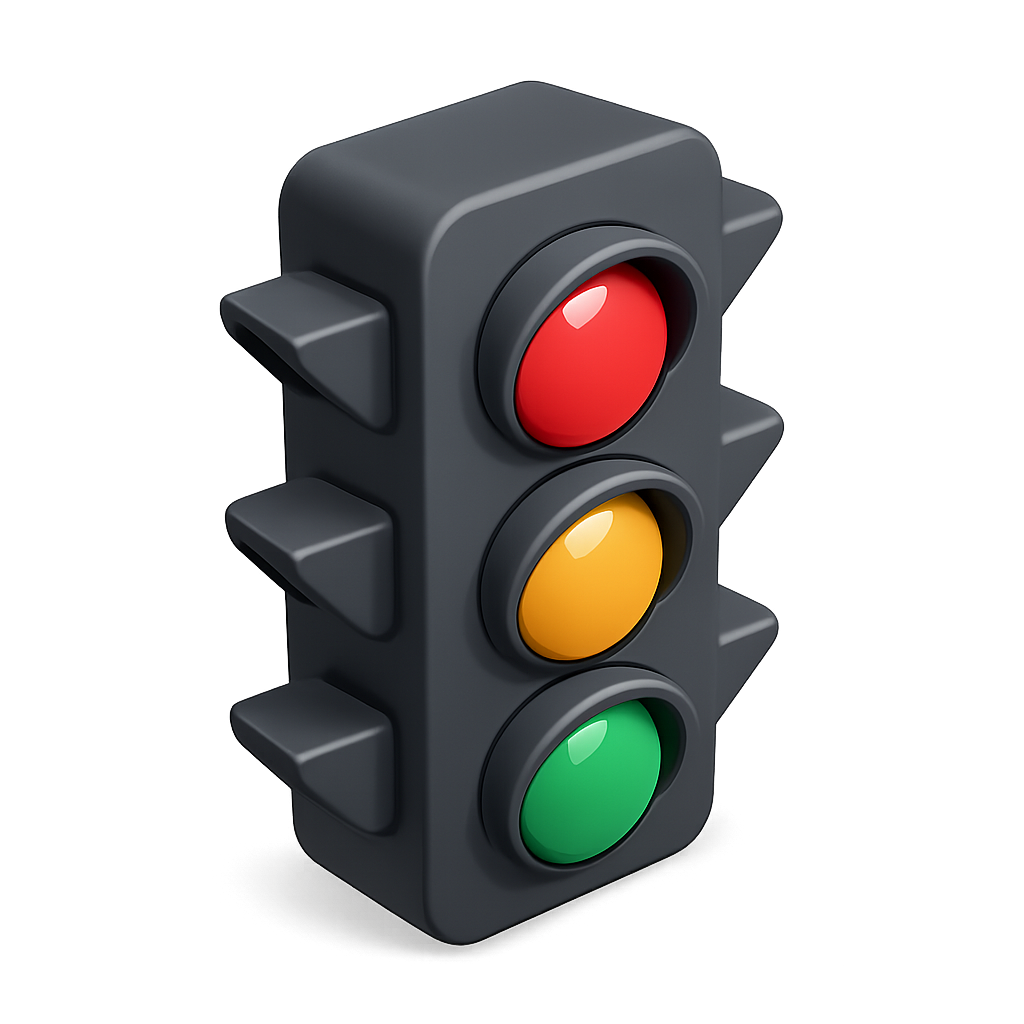 A stylish 3D traffic light icon presented in a three-quarter view. The icon features vibrant red, yellow, and green lights, set against a transparent background with a modern isometric design.