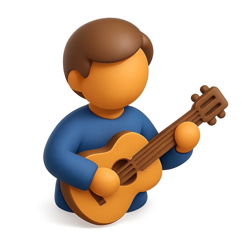 /Collection: /by davooda/Type: PNG/A simplistic 3D icon of a band member holding a guitar, depicted in a three-quarter view. The character features a round head and a blue shirt, set against a soft gradient background.