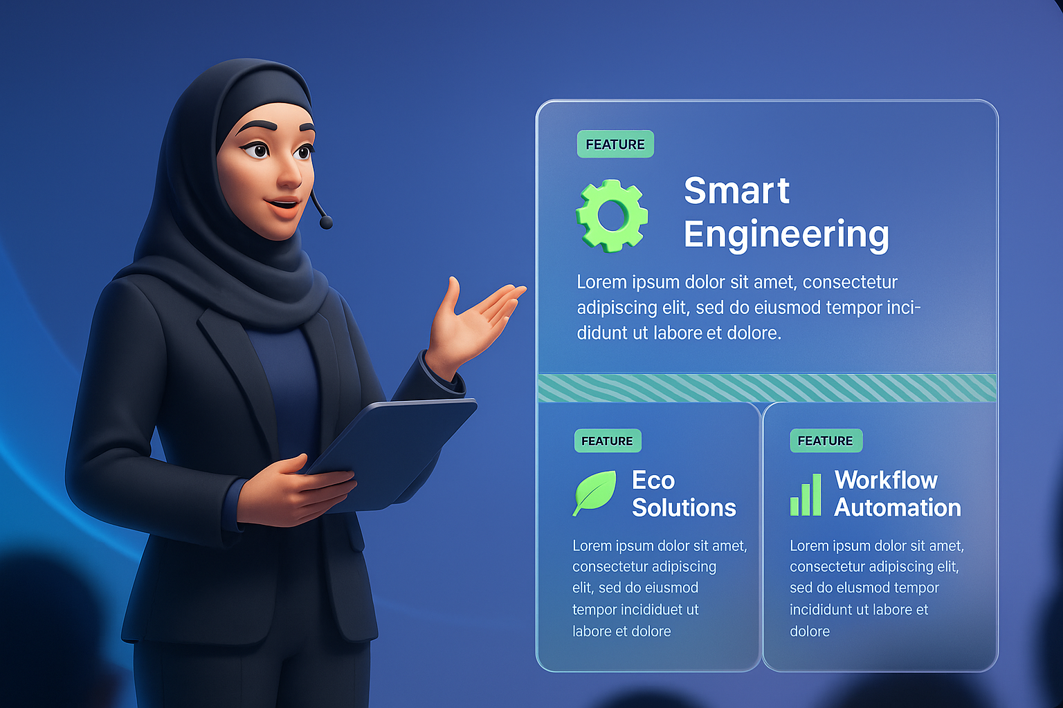 /Collection: /by davooda/Type: PNG/A professional Arab business woman stands on stage, presenting innovative solutions in engineering, automation, and sustainability. The visual features a well-structured layout with highlighted features.