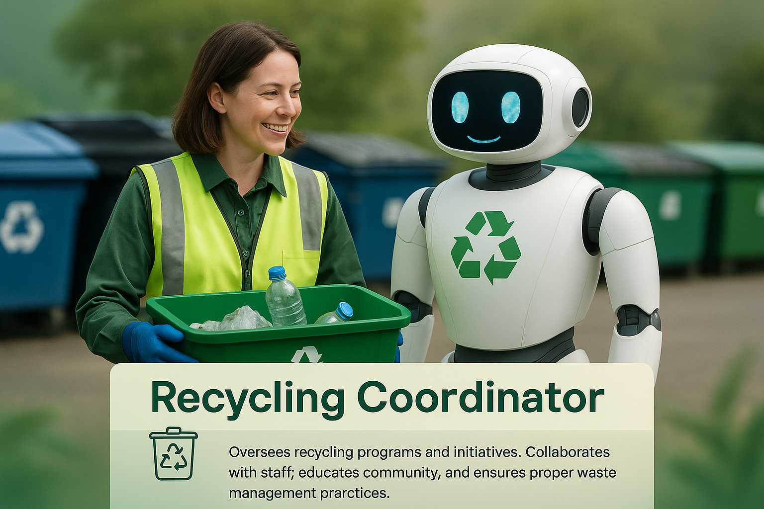 /Collection: /by davooda/Type: PNG/An image featuring a recycling coordinator with an AI assistant. The coordinator holds a recycling bin while the robot displays a friendly demeanor, emphasizing collaboration in waste management.