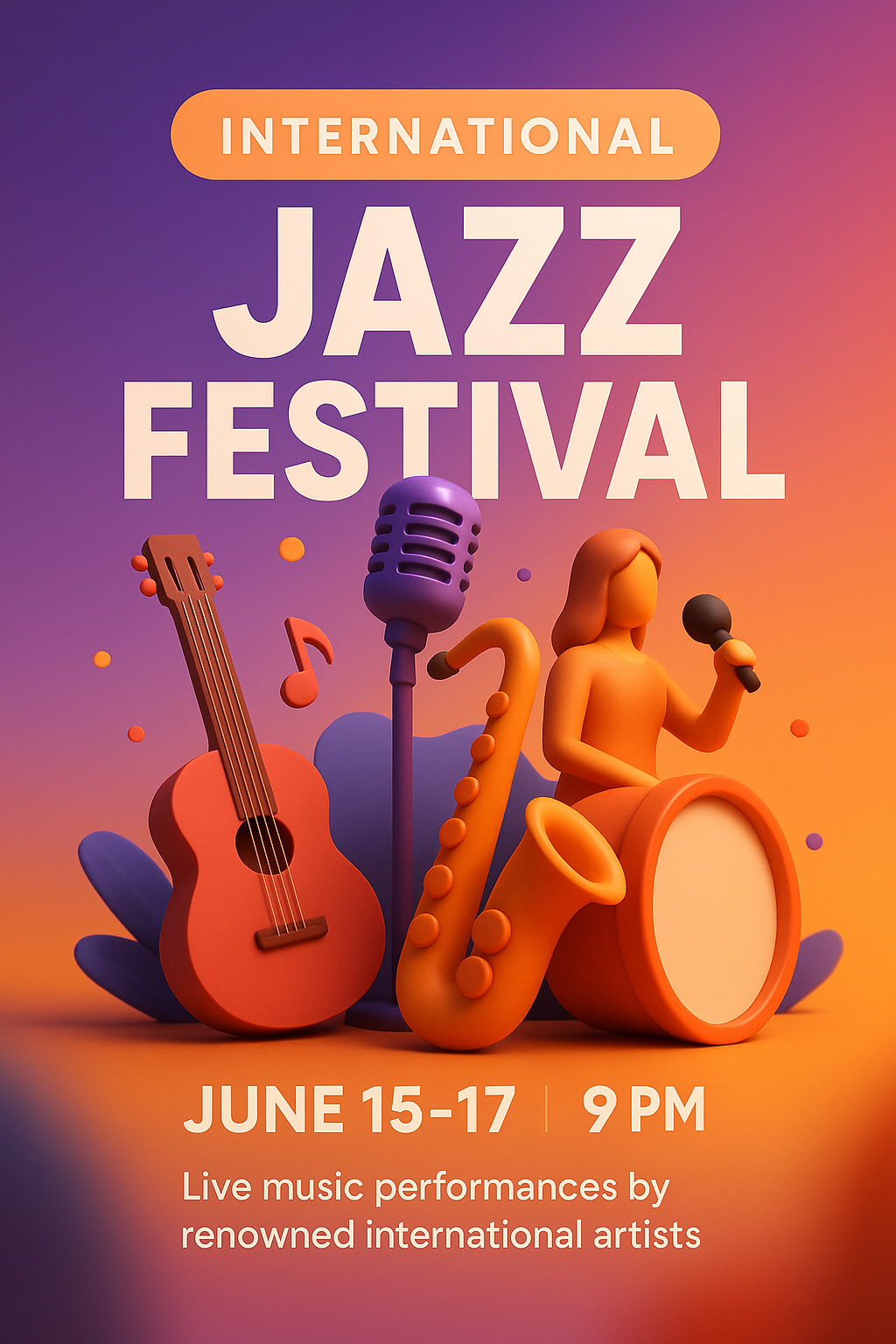 This vibrant promotional graphic features musical instruments and a singer, ideal for advertising an international jazz festival. The playful 3D design appeals to music lovers.
