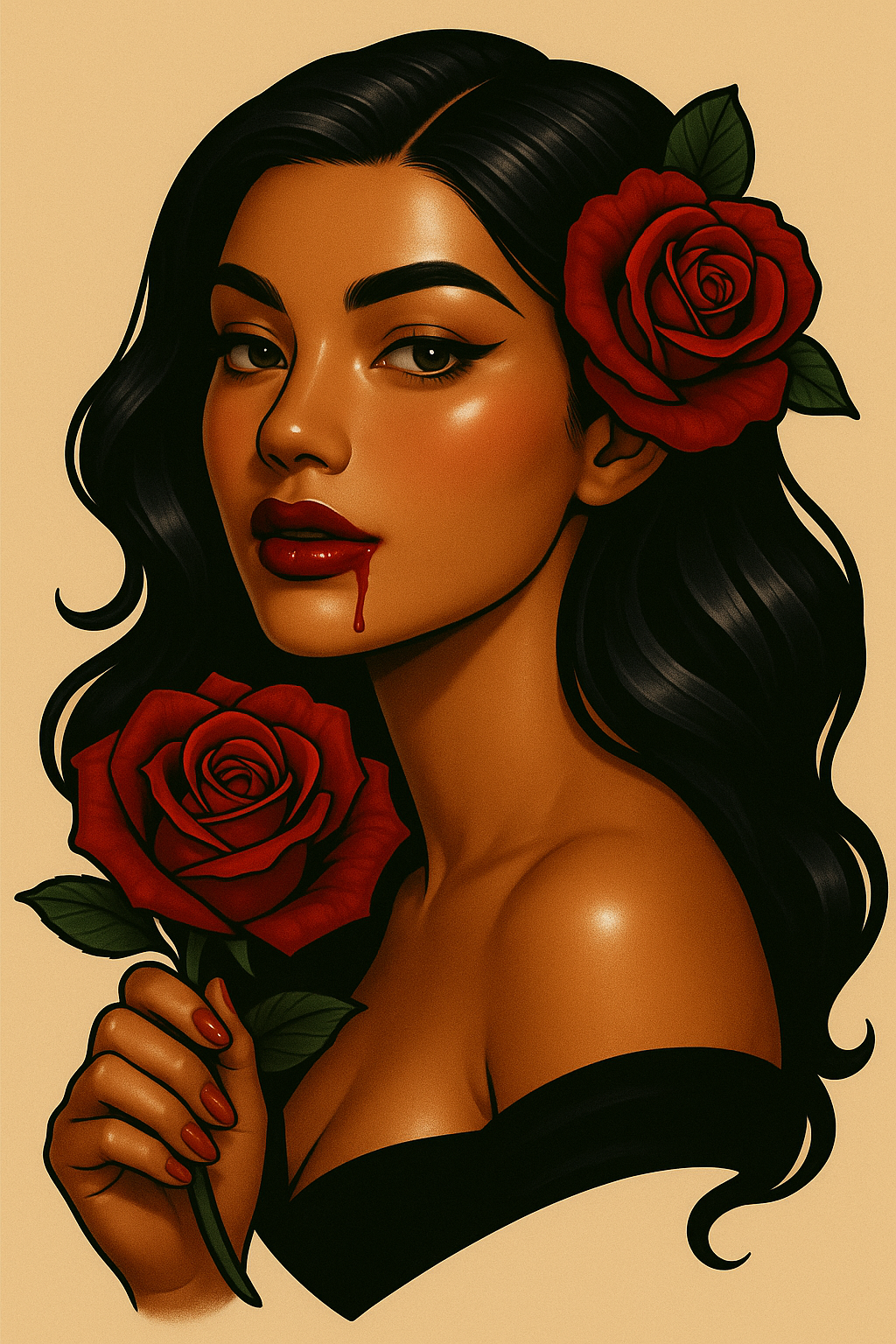 A striking portrait of a girl holding red roses, with blood on her lips. The glossy, refined style resembles classic tattoo art with anime-like highlights against a soft beige background.