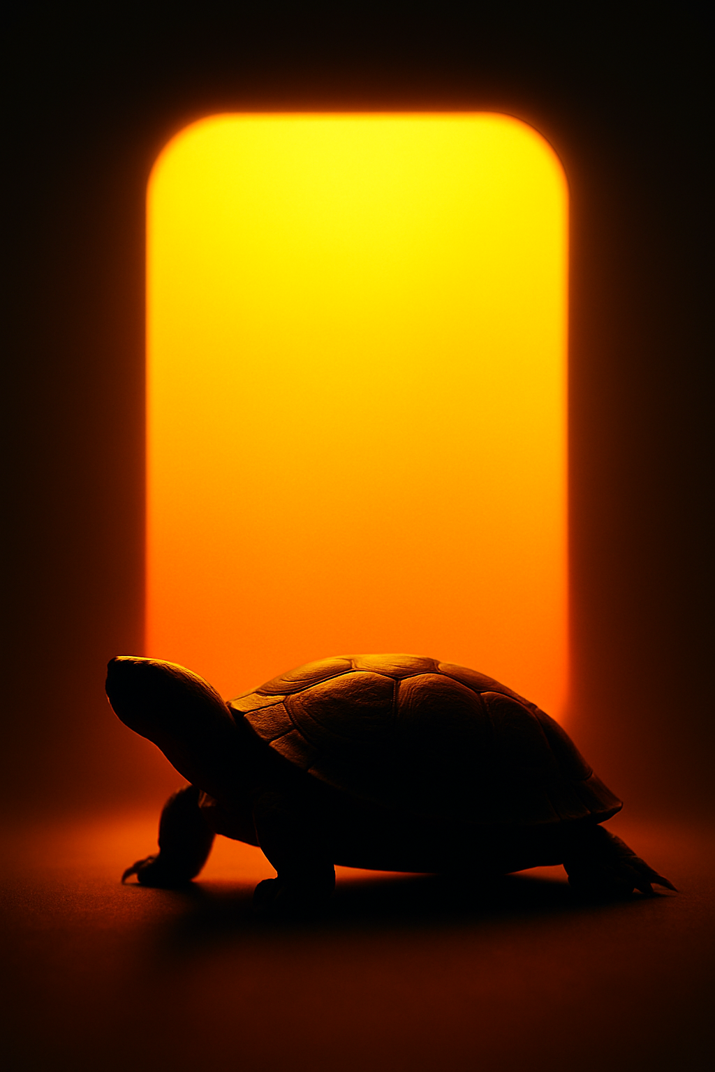A striking silhouette of a turtle against a vibrant orange gradient background, illuminated from behind, creating a 3D effect that highlights its form.