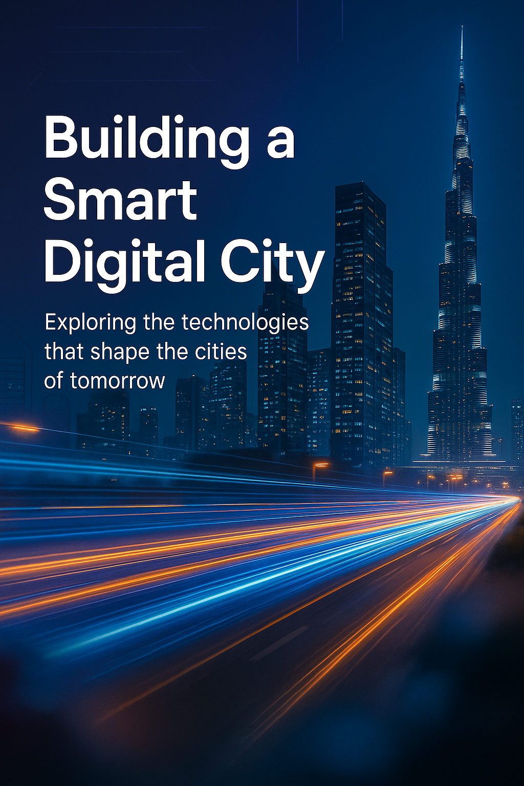 A visually striking urban graphic illustrating the concept of a smart digital city. The design features tall skyscrapers and dynamic light trails, suitable for technology and urban development discussions.