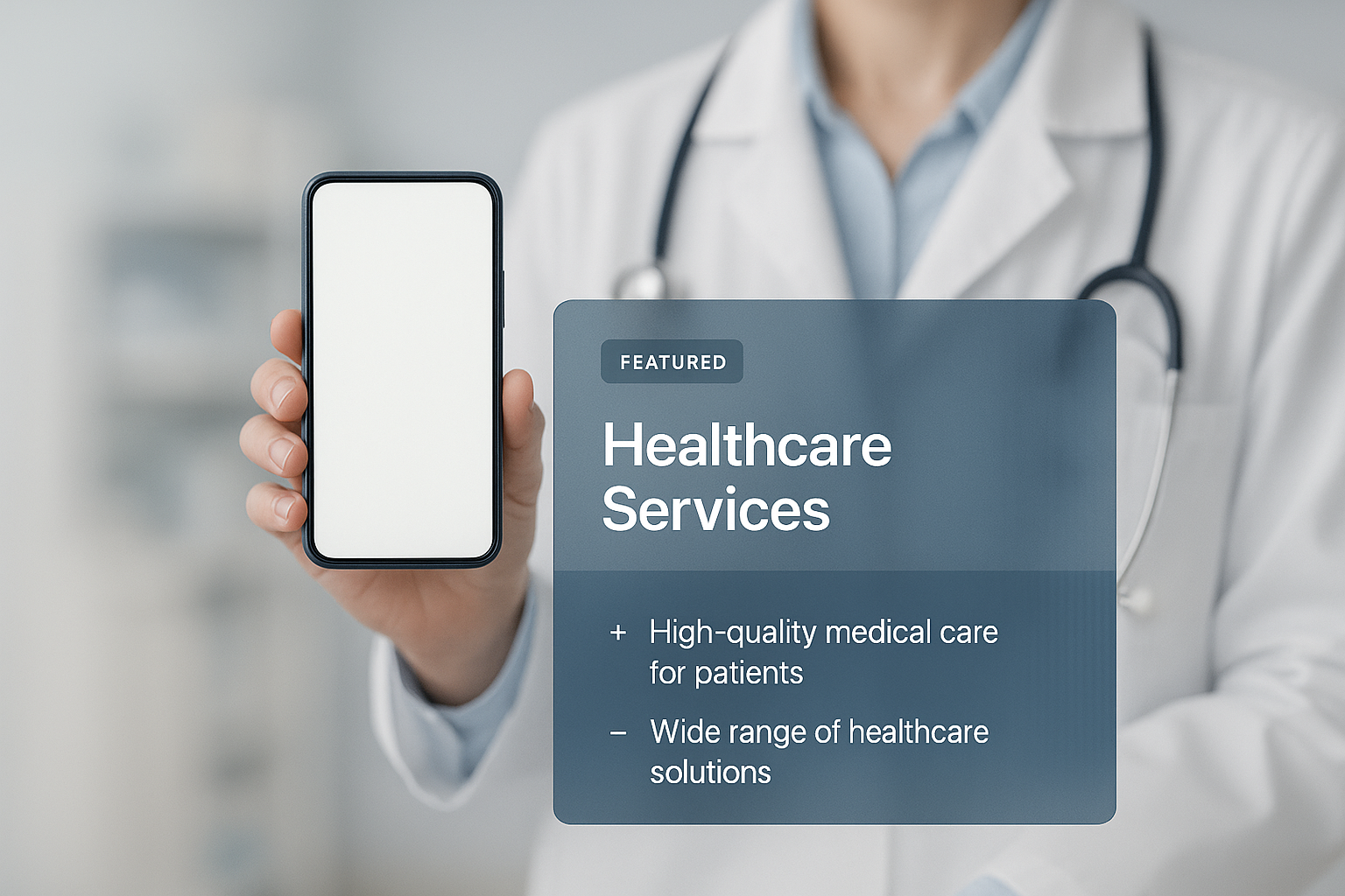 /Collection: /by davooda/Type: PNG/A pharmacist in a medical coat holds a blue phone displaying a white screen, emphasizing healthcare services with highlighted text and icons, set against a soft gradient background.