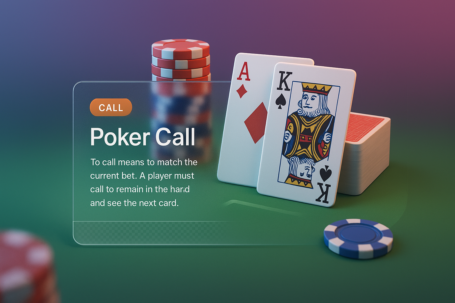 A vibrant 3D illustration featuring playing cards, poker chips, and a call bet description in a modern design. The background transitions smoothly, enhancing the overall visual appeal.