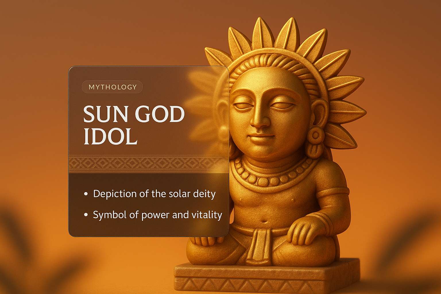 /Collection: /by davooda/Type: PNG/A detailed 3D illustration of a sun god idol, featuring a warm gradient background. The design includes a dark overlay with text highlighting its significance as a symbol of power and vitality.