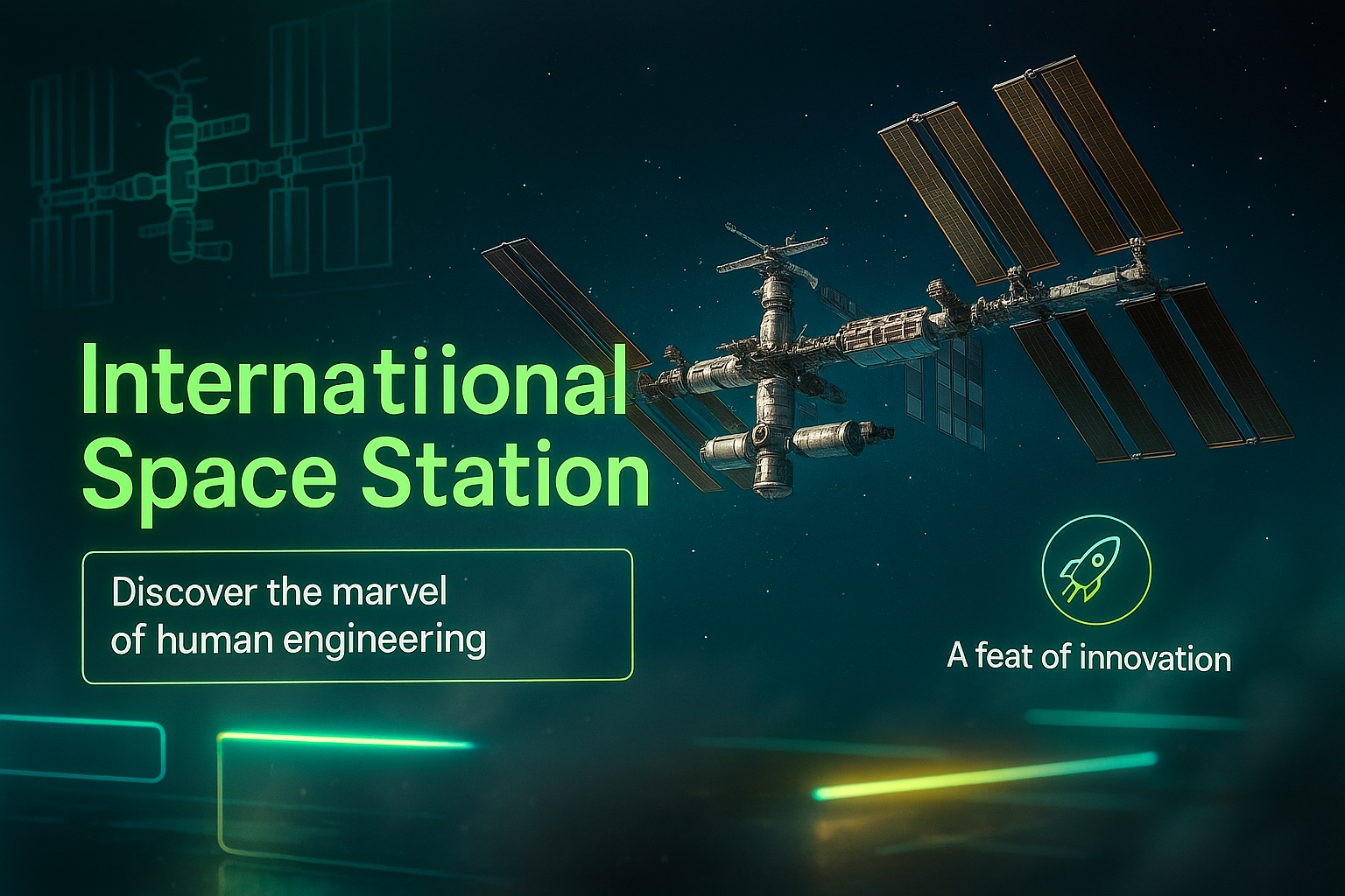 /Collection: /by davooda/Type: PNG/Visually striking promotional image showcasing the International Space Station with modern design elements, aimed at inspiring curiosity about space exploration and engineering.