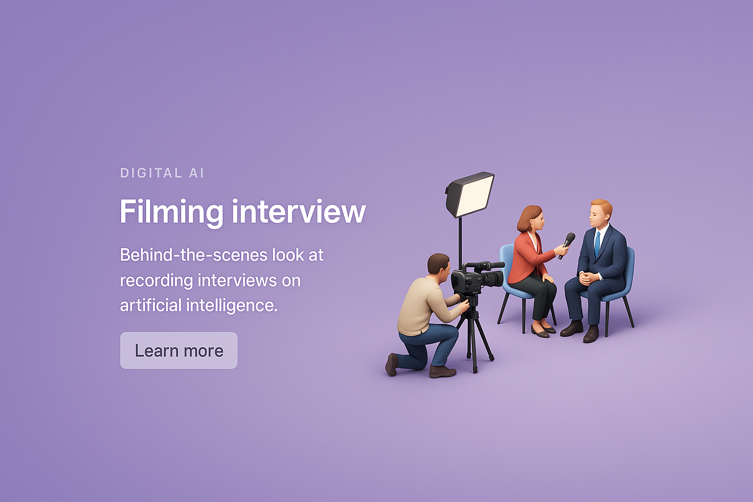 A 3D scene depicting a behind-the-scenes interview setup. A cameraman captures an interviewer and a celebrity discussing artificial intelligence, set against a smooth gradient background.