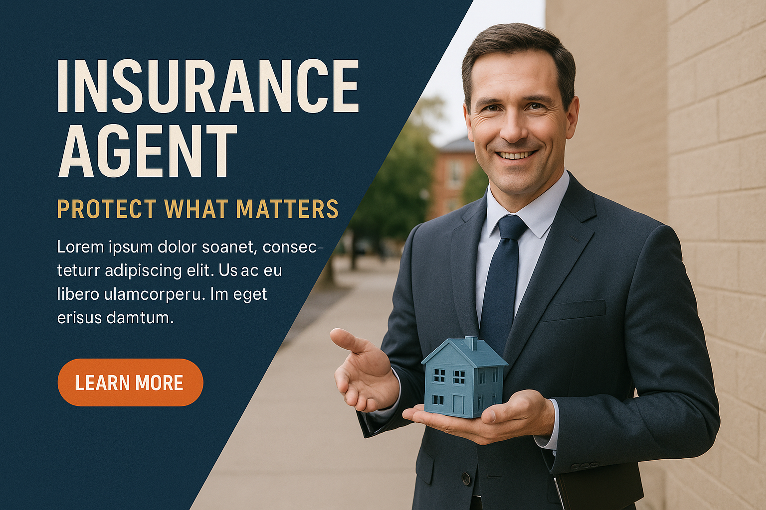 /Collection: /by davooda/Type: PNG/A professional insurance agent holds a model house, showcasing a balanced design with a clear hierarchy. The image features contrasting colors, a call-to-action button, and an engaging background.