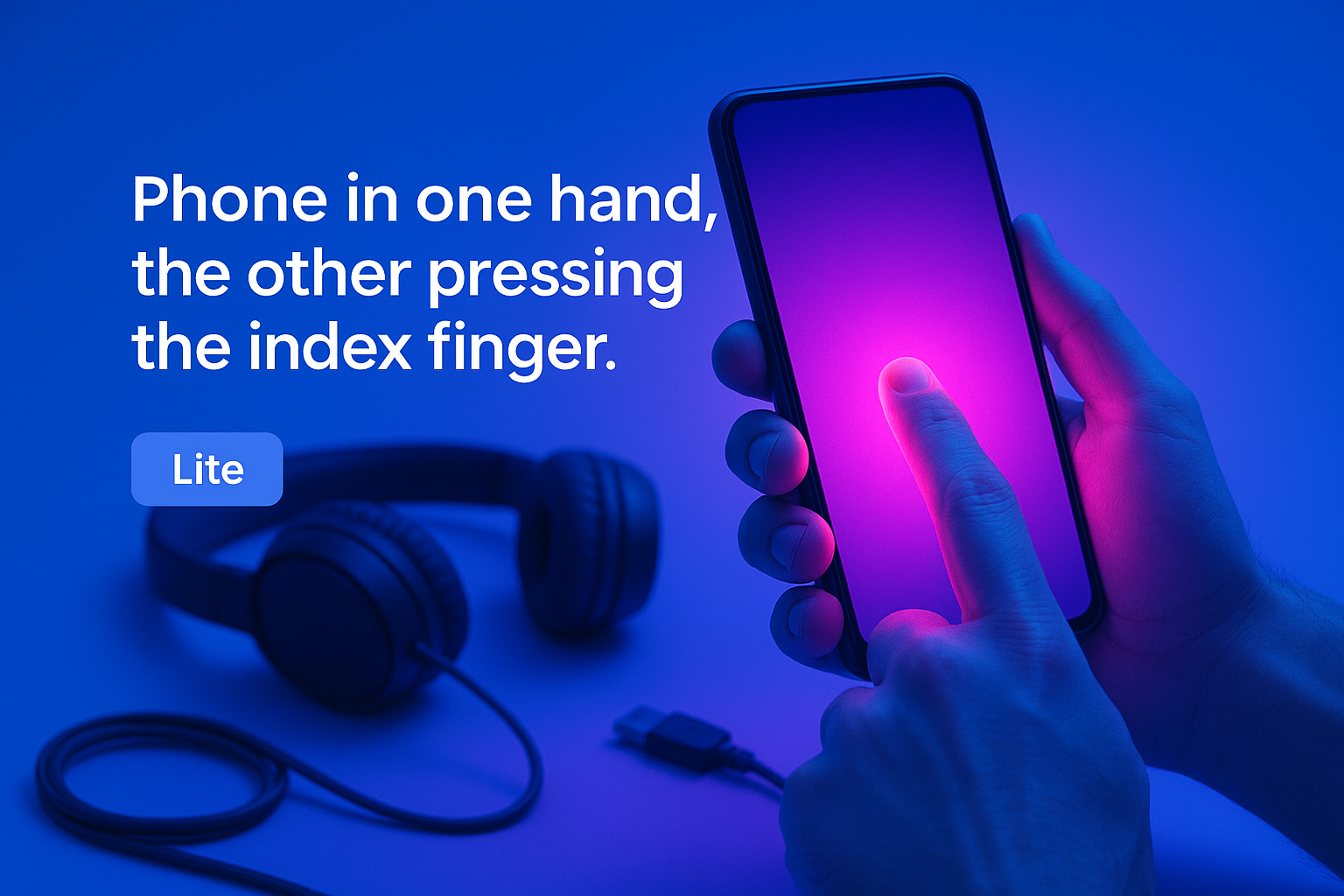 A hand holding a phone with a vibrant neon-pink glow emanating from the screen. The background is a solid blue, creating a striking contrast. Earphones and a cable are visible, enhancing the tech ambiance.