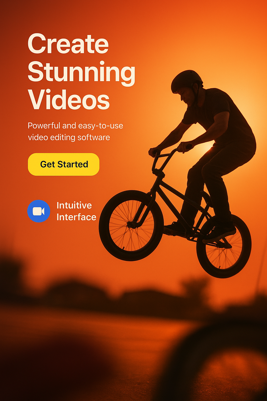 This image features a vibrant promotional graphic for video editing software, showcasing a BMX rider against a sunset backdrop. Ideal for social media or website banners.