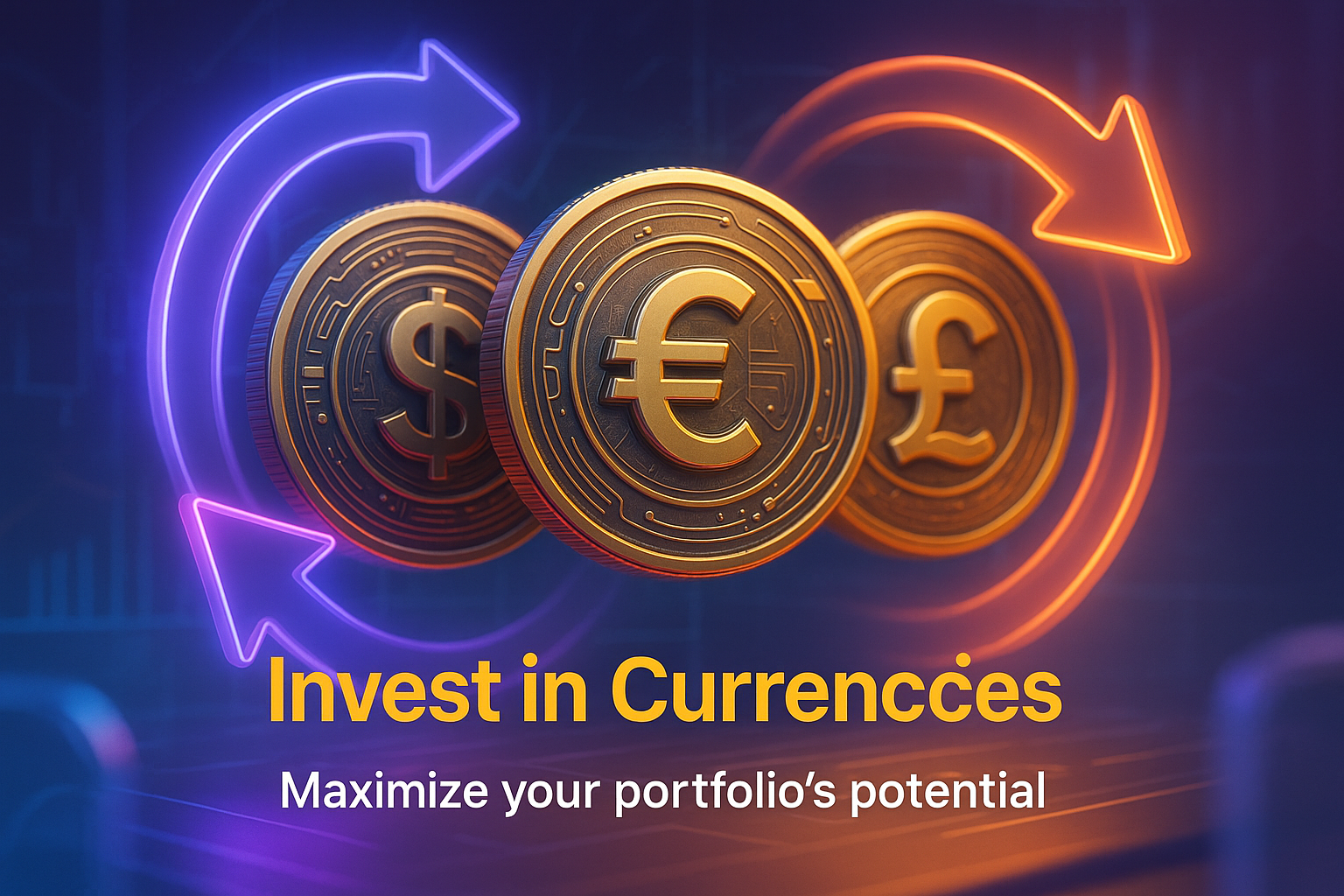 Dynamic graphic showcasing currency symbols with a modern design, aimed at promoting financial investment opportunities. Ideal for marketing materials in finance.