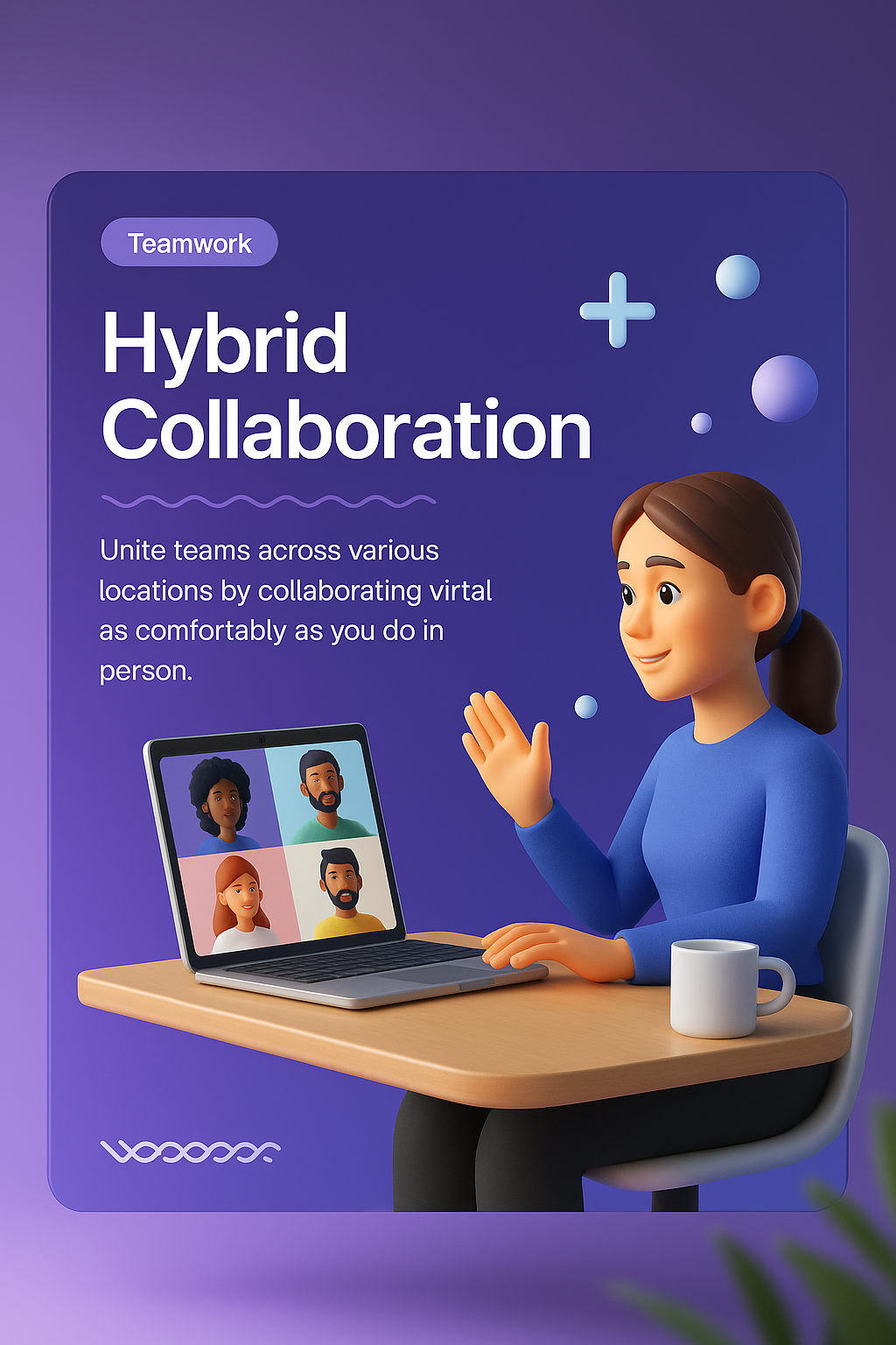 A 3D illustration showcasing a woman engaging in a video call on her laptop, representing hybrid work and teamwork in a modern setting. The background features a smooth gradient.