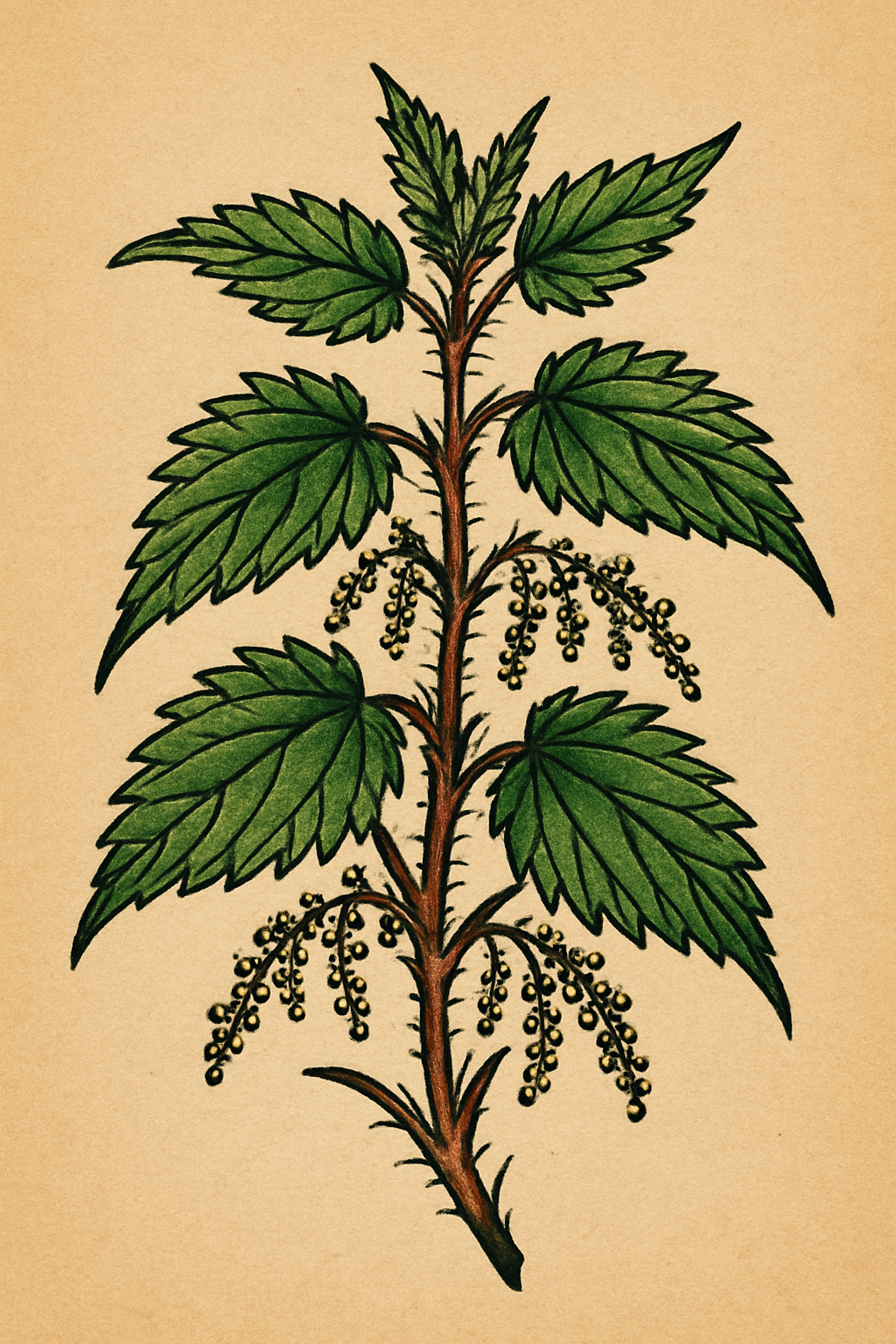 Illustration of Nettle Plant with Detailed Leaves and Flowers