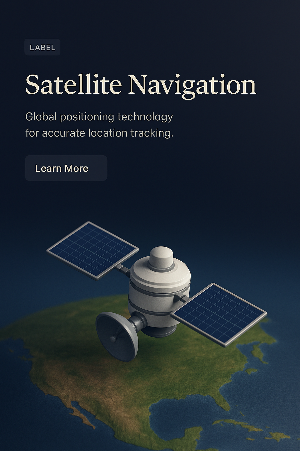 A realistic 3D representation of a satellite in a dark-themed environment. The satellite features solar panels and is shown hovering above a stylized Earth, emphasizing global positioning technology.