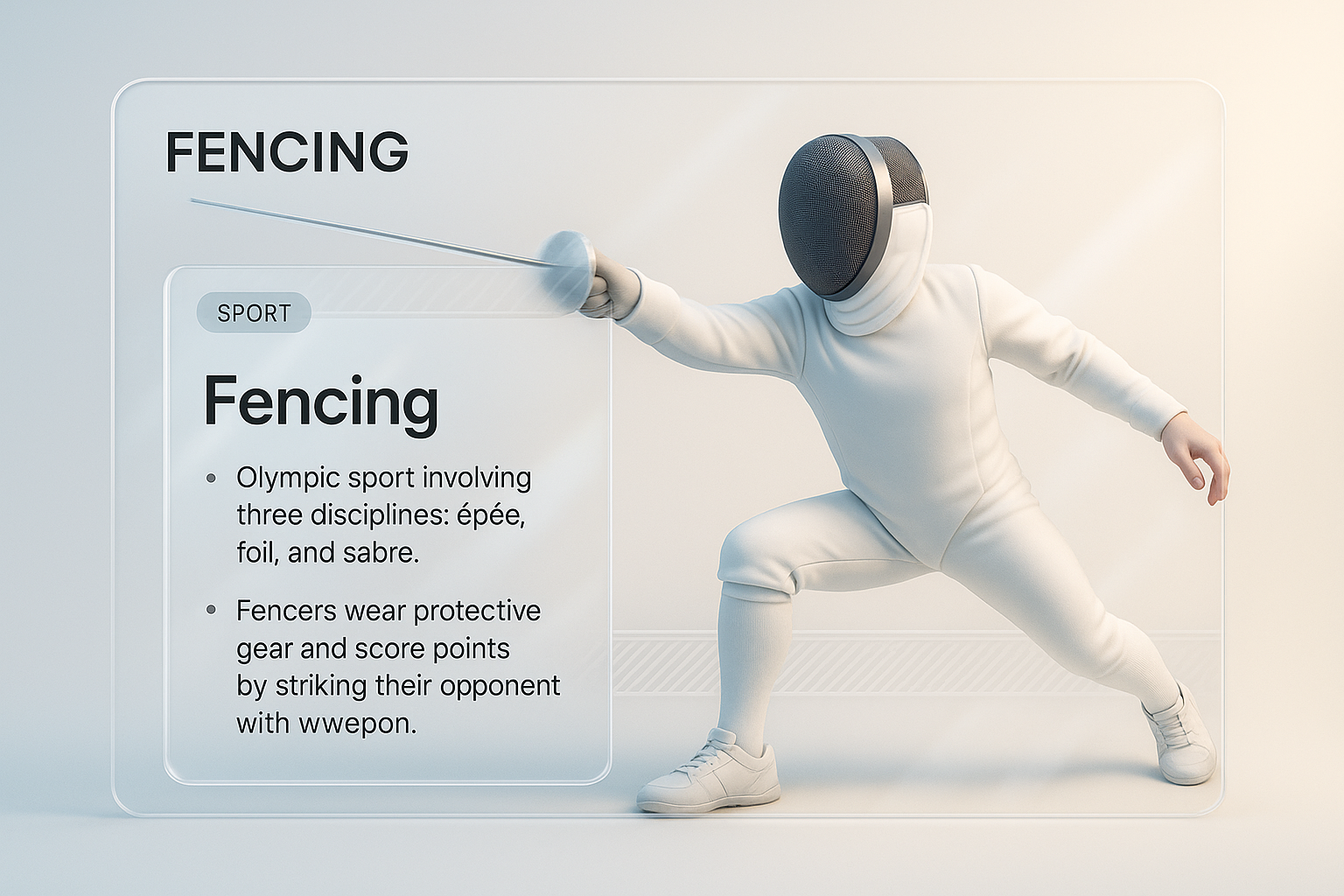 /Collection: /by davooda/Type: PNG/A captivating 3D illustration of a fencer in action, showcasing a sleek design with transparent overlay elements. The fencer is depicted in protective gear, poised to strike.