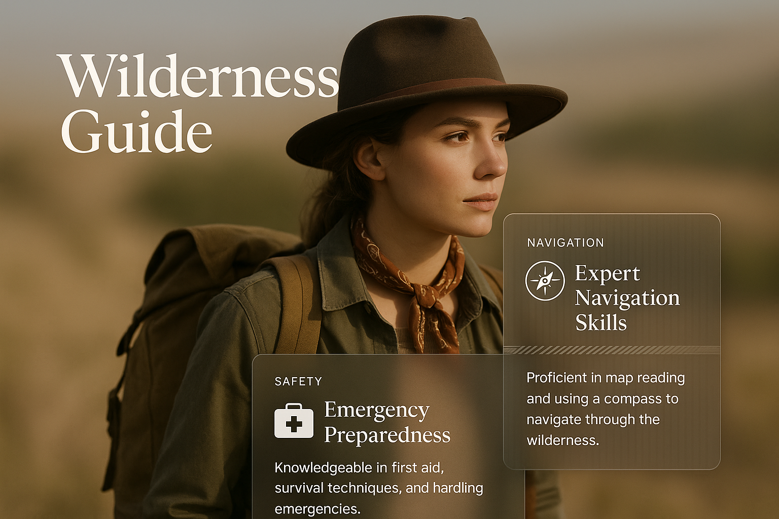 /Collection: /by davooda/Type: PNG/A stylish illustration of a wilderness guide in a natural setting, featuring integrated text blocks highlighting navigation and safety skills, set against a smooth gradient background.
