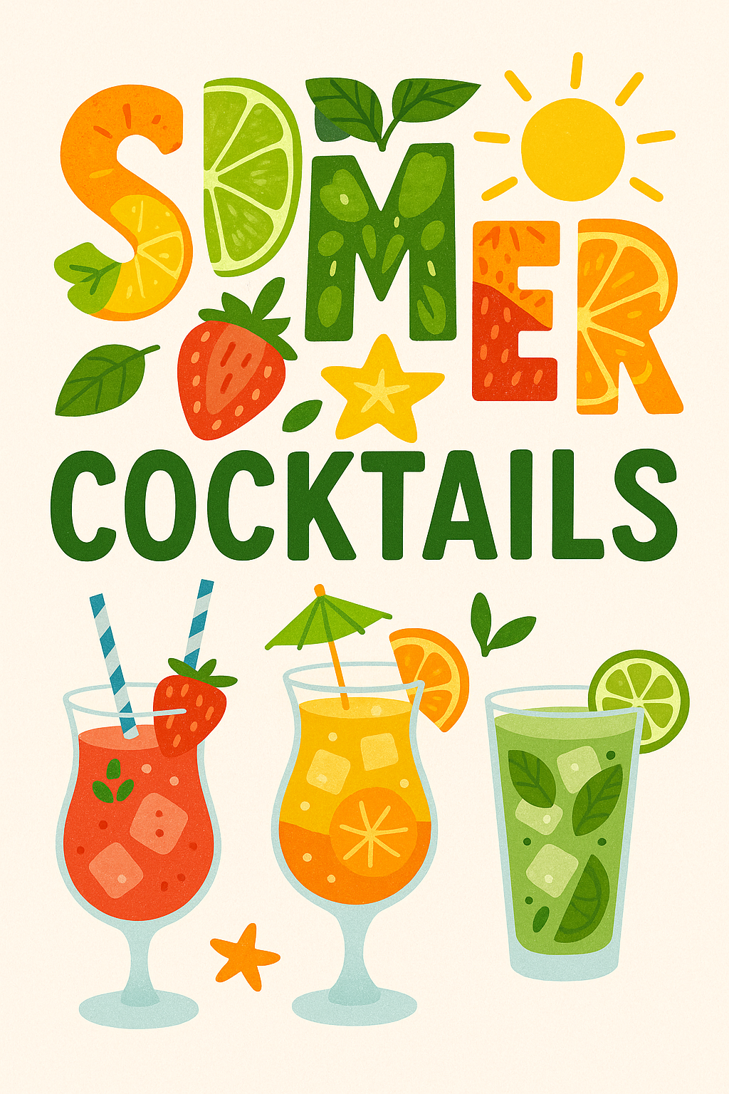 /Collection: /by davooda/Type: PNG/Vibrant illustration featuring three cocktails and playful typography, ideal for summer-themed promotions or events. The design is cheerful and inviting, perfect for social media or print.